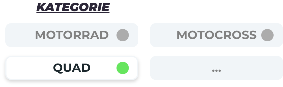 Motorrad-, Motocross-, Quad-, Kart- oder SSV-Fahrer, wählen Sie Ihre Welt mit 1 Klick. Sind Sie eher für schlichtes, auffälliges oder beides Design? Entdecken Sie die verschiedenen Stile, Classic, Marker, Fastline... Fügen Sie die Marke Ihrer Maschine hinzu. Jetzt sind Sie bereit, mit der Personalisierung Ihrer Teppich zu beginnen.